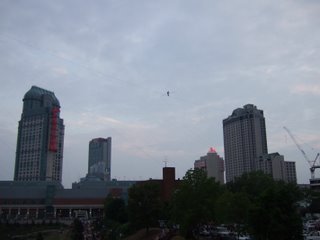 Ein Seiltänzer in Canada. Ohne Netz und Sicherungsseil spaziert ein alter Mann über die Stadt an den Niagara Fällen hinweg.