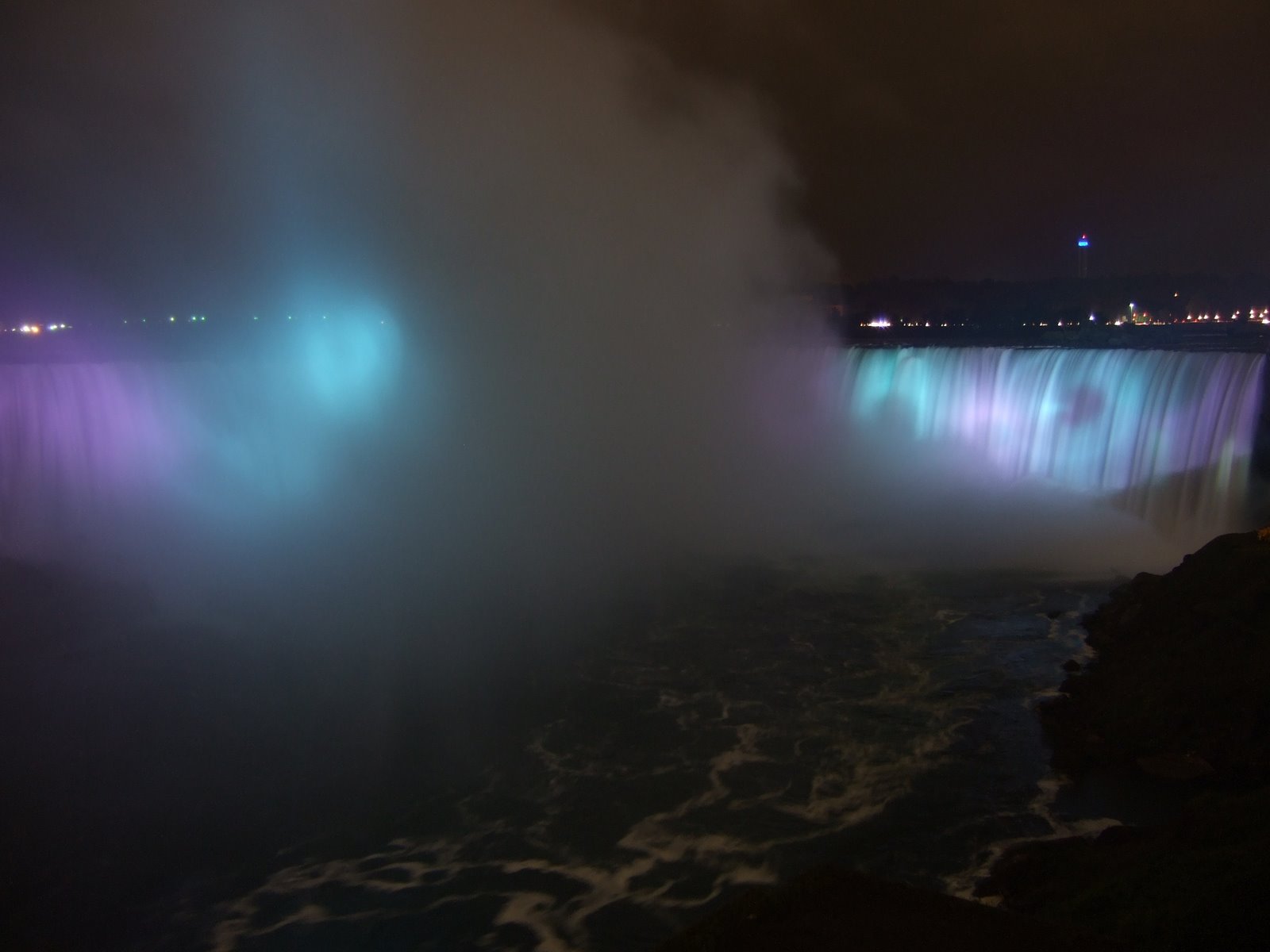 Sicht von der canadischen Seite auf die Niagara Fälle.Nachts werden die Wasserfälle von der canadischen Seite aus bunt angestrahlt. Die Farben wechseln von gelb über lila, blau, grün, rot nach weiß.